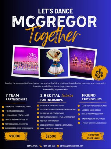 We invite you to partner with Let’s Dance McGregor in supporting youth and dance education in our community. For over 31 years, our studio has served as a cornerstone for artistic development, cultivating discipline, confidence, and teamwork in young dancers. Our mission extends beyond the studio, building character and creativity that